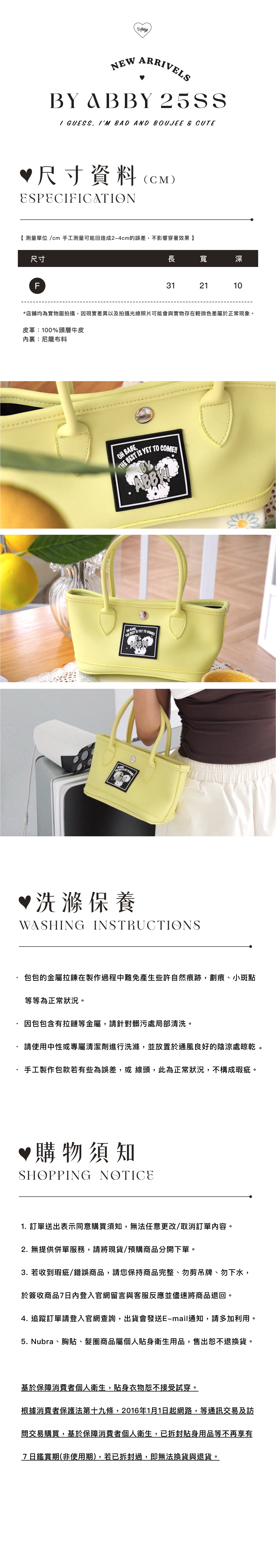 散發高質感與春夏清新氣息的[Bonjour Bag 真皮手提小包] —採用精選真皮,材質堅韌細膩,隨著時間逐漸呈現自然光澤與紋理深度 。搭配品牌訂製的黑白漫畫感矽膠標籤,讓整體色調更添清爽可愛感,非常適合春夏季節。包口擴長設計使容量比外觀想像更大一些,日常手機、錢包、小物皆可輕鬆收納。內裡採用尼龍布料,實用耐髒又防水還帶有品牌皮標,精緻展現質感;按扣開關則使讓拿取物品時更方便,實用穩固兼顧美觀 。簡潔優雅外型融合實用容量與細膩細節,是春夏造型的理想配件。