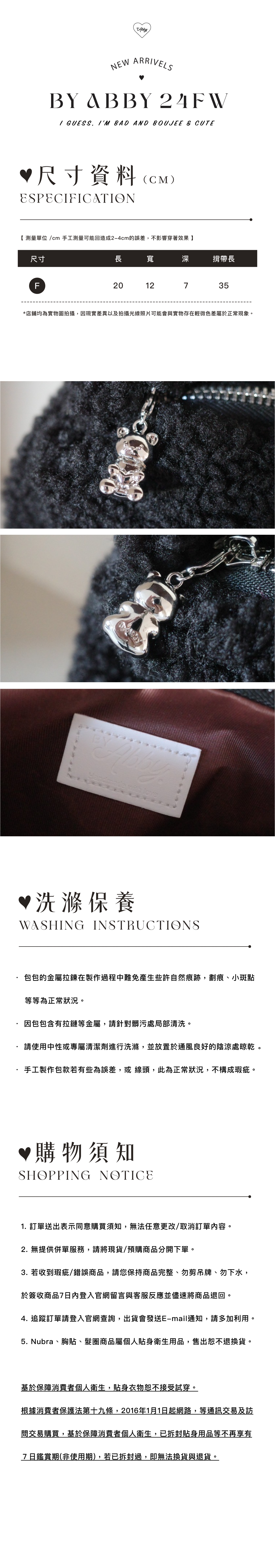 仿羊羔毛的材質,非常適配於冬天裡的各種穿搭,是冬季必備的時尚單品!特殊訂製的熊熊造型立體拉鏈,材質為堅固耐用的鋅合金,為包包增添了可愛與俏皮感,讓整體設計更加吸引眼球。內裏布採用防撥水材質,搭配白色品牌皮標,提升單品精緻度。