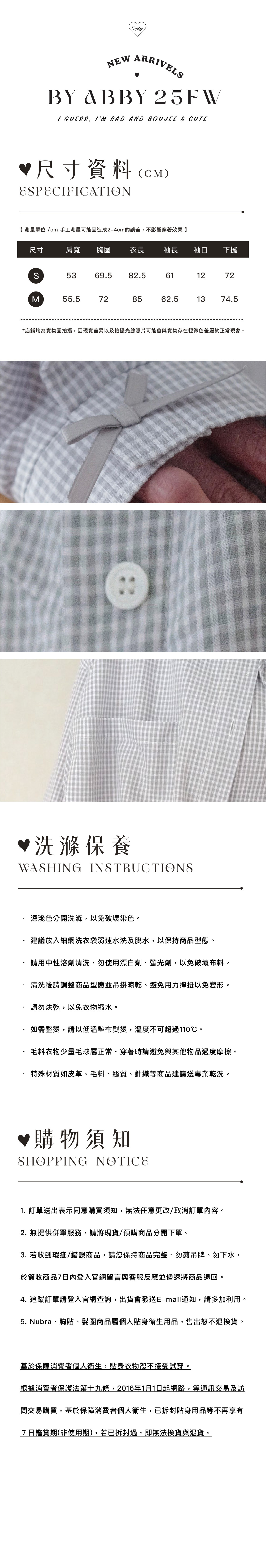 [Phoebe Shirt 蝴蝶結格子襯衫] 選用超可愛的細格子布料,100%純棉材質,透氣吸濕、清爽舒適,非常適合炎炎夏日穿搭。Oversized寬鬆版型,不僅輕鬆百搭,還給人滿滿的安全感。可當作防曬外套輕鬆罩上,實用又有型。袖口特別設計了蝴蝶結綁帶(無鈕扣),增添甜美氣息,是一款結合實用性與可愛風格的夏日必備單品!
