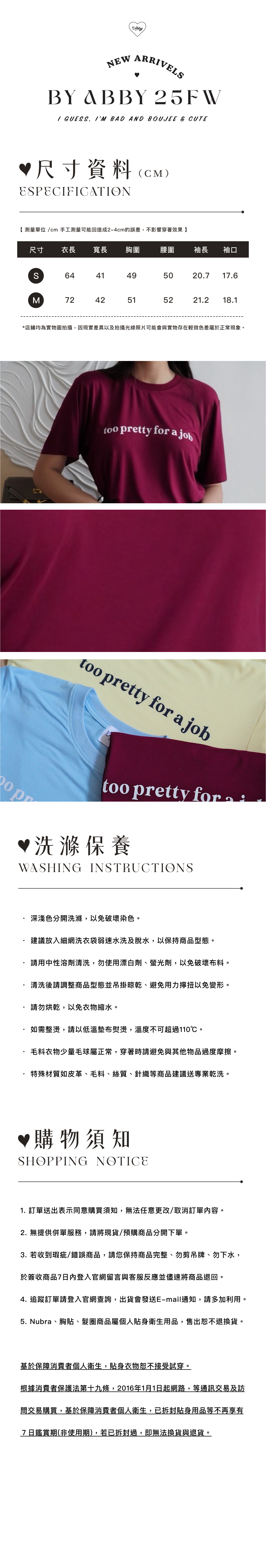 此款為「too pretty for a job」系列推出三款配色 T-shirt,以簡約設計打造百搭單品。正面以低調卻帶點俏皮態度的 「too pretty for a job」 英文字樣作為設計亮點,呼應系列襯衫、短褲與髮圈,讓整體穿搭更具一致性。版型舒適不挑身形,日常穿著輕鬆自在,不論單穿或作為內搭都能展現時髦感。三種顏色滿足不同風格需求,隨心搭配都能輕鬆營造率性又俐落的氛圍,是衣櫃裡必備的百搭單品。